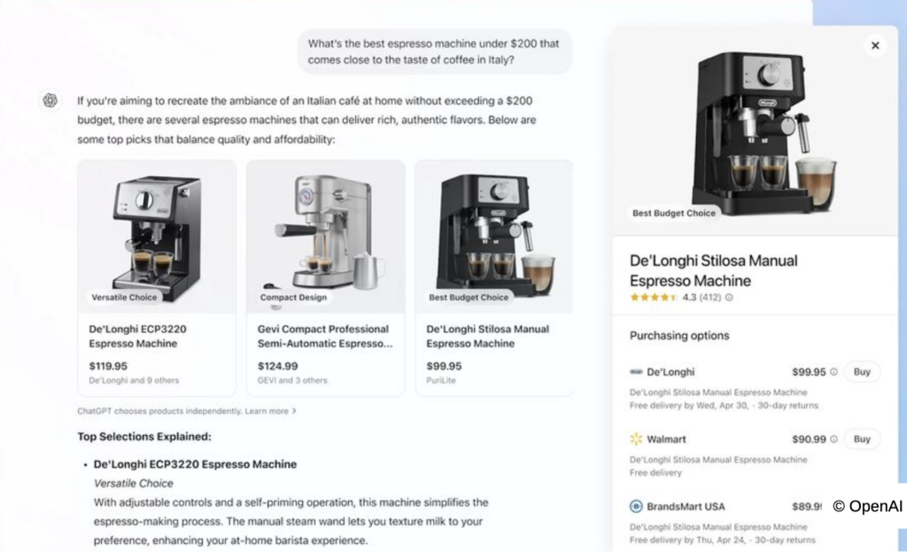 Depuis septembre 2025, par exemple, ChatGPT propose un système d’achat intégré, permettant de recommander des produits et de déclencher un paiement sans redirection vers le site du marchand. Toute la chaîne (recherche, comparaison et paiement) peut se dérouler dans la conversation.